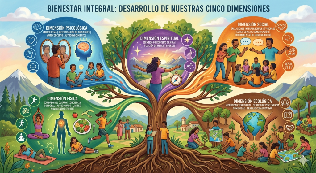 Entendemos el bienestar integral como el desarrollo armónico de cinco dimensiones: